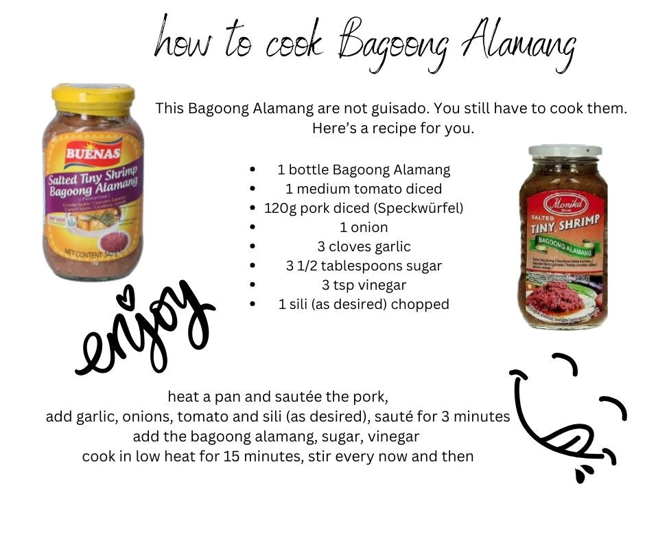 Expiry date: 2026/05/31This Bagoong Alamang / Garnelen Paste is a popular condiment made from fermented shrimp or krill. It is a staple of Filipino cuisine and adds a delicious salty, fishy flavor to savory dishes. Use it as a seasoning, a condiment, or an ingredient in recipes.