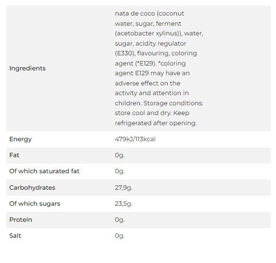 Expiry date: 2027/11/04This exotic treat will have your taste buds singing! Get ready to indulge in 340g of Nata de Coco / Kokosgelwürfel red – a delightful blend of tropical flavors, just bursting with deliciousness. You'll be saying 'Aloha' to a sweet snack-time experience!