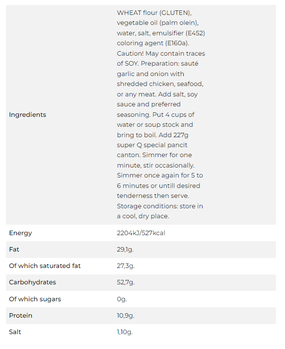 | Preparation: sauté garlic and onion with shredded chicken, seafood, or any meat. Add salt, soy sauce and preferred seasoning. Put 4 cups of water or soup stock and bring to boil. Add 227g super Q special pancit canton. Simmer for one minute, stir occasionally. Simmer once again for 5 to 6 minutes or untill desired tenderness then serve. Storage conditions: store in a cool, dry place. |