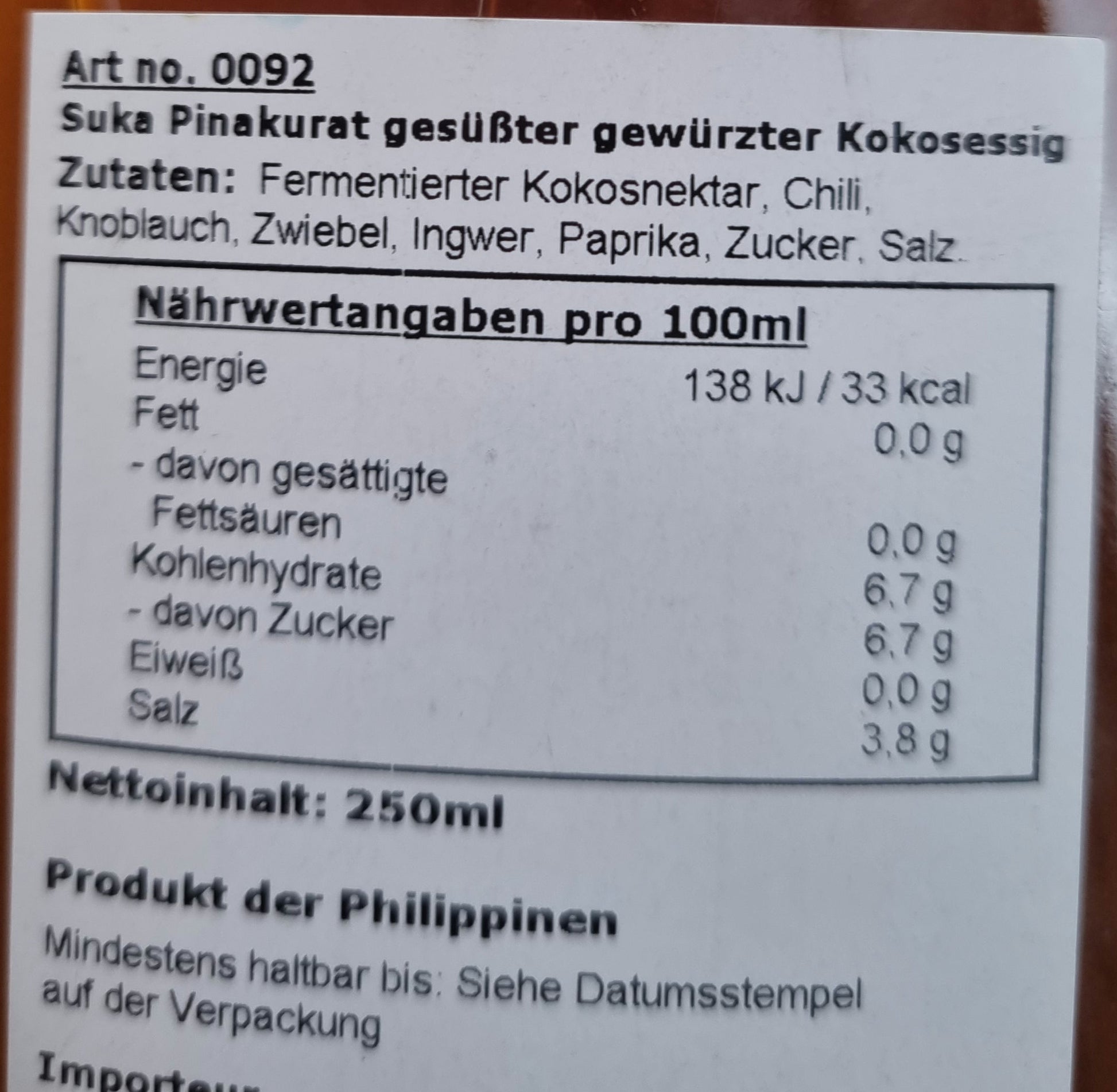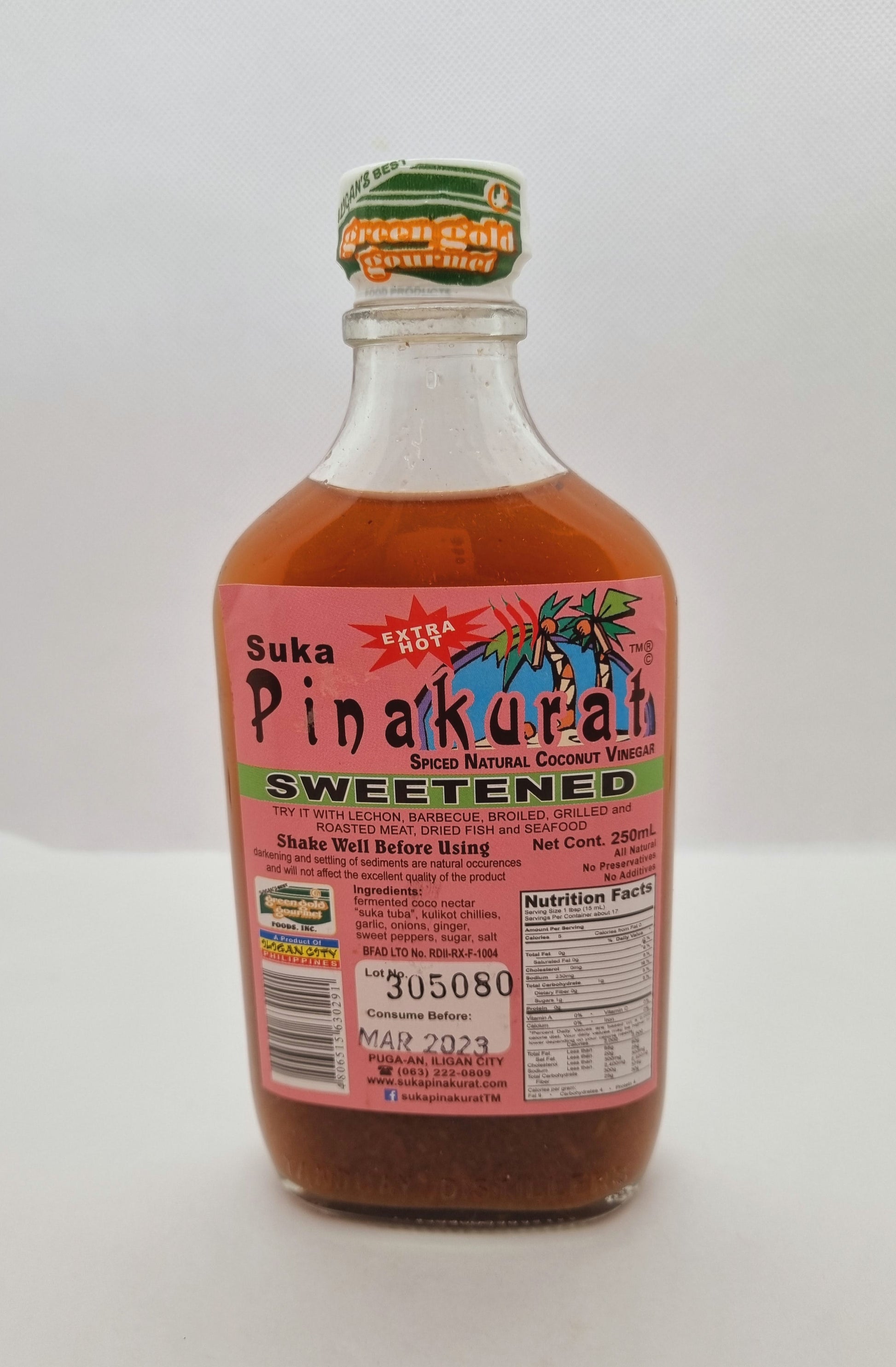 Expiry date: 2026/03/19Experience the unique flavor of Suka Pinakurat Vinegar! Sweetened and made with the finest ingredients, this 250ml bottle will add a delicious and tangy touch to any dish. Indulge in the perfect balance of sweet and sour and elevate your meals to new heights with Suka Pinakurat.